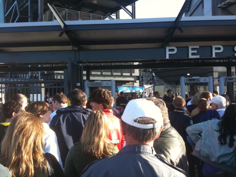 When the game started, thousands of fans were stuck outside the Linc. Security put every entrant to the game through a metal detector and a full-body frisk. The lines were so long that, by the time we got to the front, we couldn’t see the end of the line.