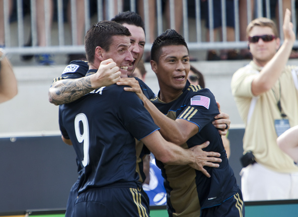 Michael Orozco, Danny Califf and Sebastien Le Toux celebrate a goal vs. Toronto. (Photo: Daniel Gajdamowicz)