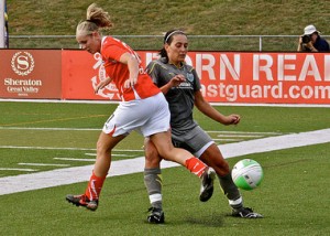 The Philadelphia Independence hosted Washington Freedom on Sunday in the first round of the WPS playoffs, and it was a nervous start for both teams. Although Washington’s Abby Wambach had a chance to score in the third minute, she headed the ball wide of goal. After that, the Independence defense effectively shut down the league’s third highest scorer save for one scary moment in the 65th minute when Wambach intercepted a lazy pass to make a run on goal. But Independence keeper Val Henderson was well positioned and Wambach was forced away from goal and into a sliding strike that was just wide.