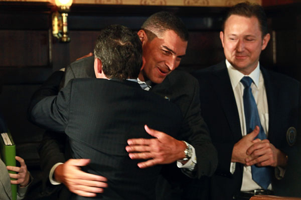 It’s all about the love. Mondragon gives Nowak a hug while Sakiewicz looks on.