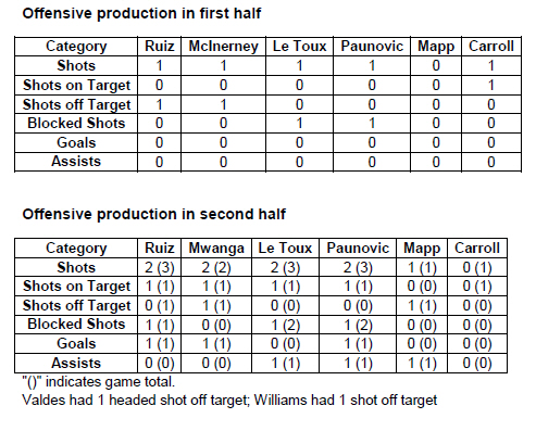 In the Stat Chat for the Vancouver game, I suggested that Le Toux was showing improvement over the previous nine games with a shots on goal percentage of 29% (five shots on goal from 17 shots) compared to a shots on goal percentage of 20% (two shots on goal from ten shots) for the first five games. Adding Le Toux’s numbers from the Kansas City and Chivas USA game to the previous nine results in a shots on goal percentage of 28% (seven shots on goal from 25 shots). Over the past three games, Le Toux’s shots on goal percentage is 18% (two shots on goal from 11 shots). His shots on goal percentage for the season thus far is 26% (nine shots on goal from 35 shots)