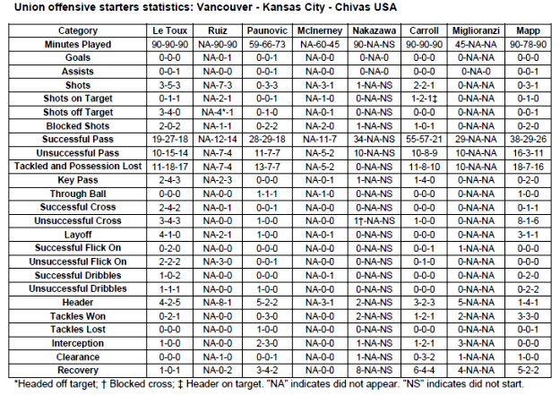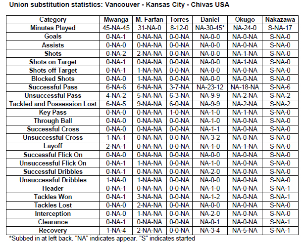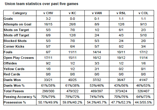 While the attempts on goal and possession percentage for the Union and Chivas USA were both close, the Union recorded more shots on target. They did so with a significant drop in total passes compared to the previous four games, the 298 passes recorded being the lowest total since the 285 recorded against Toronto. Interestingly, the two times the Union have recorded fewer than 300 passes since detailed statistics became available with the San Jose game have been wins. During that time period, in the five games the Union were out-passed by their opponent their record is 3–0–2. In the six games they out-passed their opponent over that time period, the Union’s record is 1–3–2.