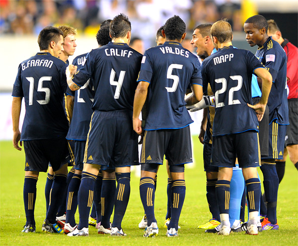Danny Califf heads the ball while Karim Benzema admires his tattoos.