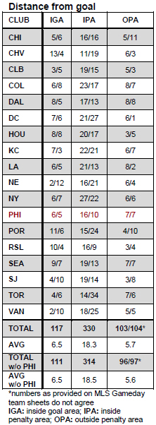 In terms of the distance of goals scored against the Union, nearly two fewer goals have been allowed from within the goal area, with eight fewer goals allowed from within the penalty area. The Union allowed about one more goal from outside the penalty area than the league average.