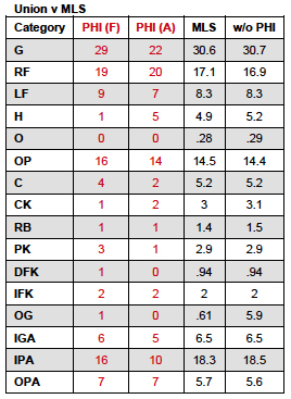 Comparing how the Union scores to the league averages for the various categories, the Union scored more goals from both feet than the league average, more goals from open play, and more goals from outside of the penalty area.