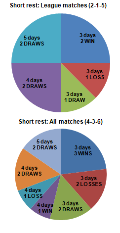 At home that works out to a 2–0–3 league record on short rest, 0–1–2 on the road.