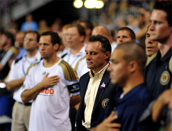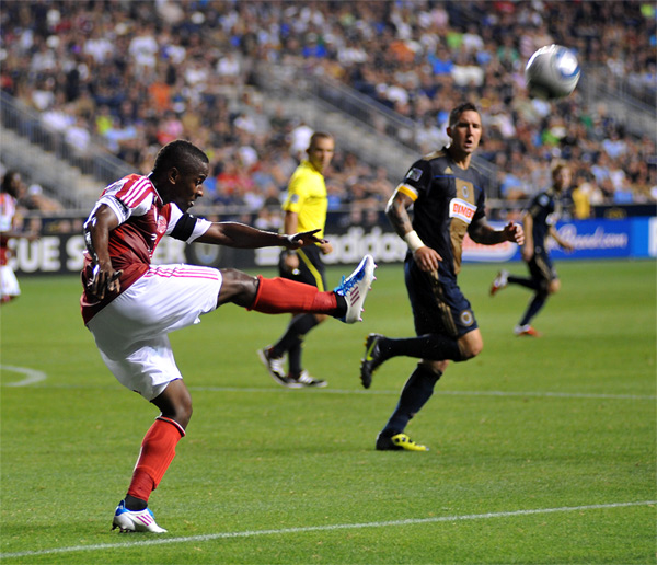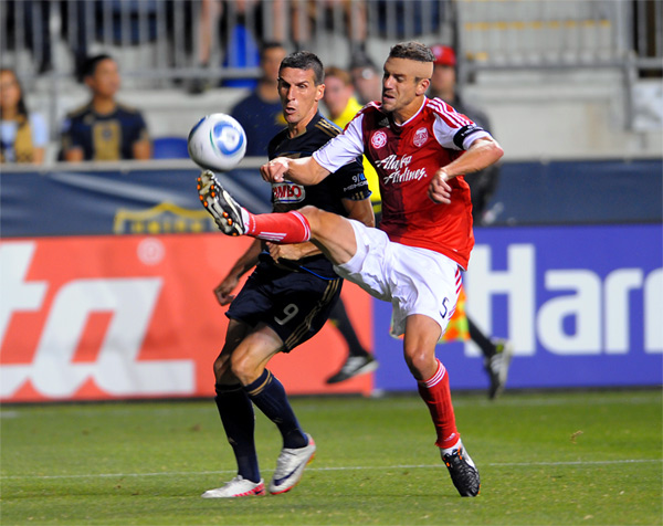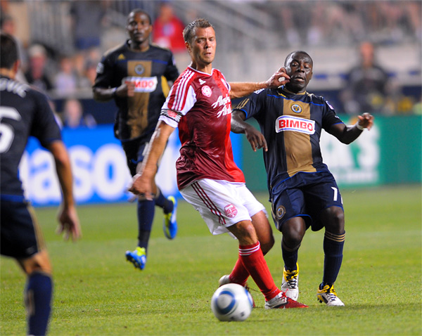 Photo by Earl GardnerLe Toux battles Eric Brunner for the ball.