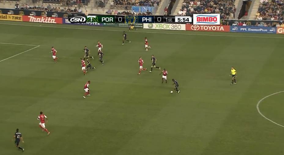 This has been a persistent problem for the Union this season: When they get the ball, it’s like they all have a Le Toux mindset. Forward, we go! Now, there is no problem if Le Toux wants to look for that ball over the top. But everyone?
