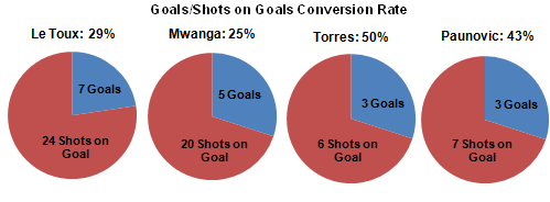 Yes, but should not shots on goal represent the entire pie, while converted goals represent a piece of the pie? Then, Torres’ 50% conversion rate would give him half the pie, not 1/3 as it appears now.