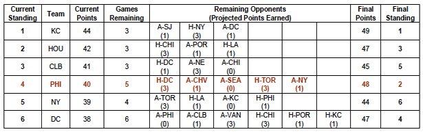 On the latest edition of the Philly Soccer Show podcast, co-hosts Greg Orlandini of KYW NewsRadio and Eli Pearlman-Storch of the Philly Soccer Page were joined by Philly Soccer Page writer Adam Cann for a roundtable discussion of the Philadelphia Union’s playoff chances. During the discussion, Eli devised a grid projecting the final season standings for the Eastern Conference that included projected points earned in each of the remaining games. The conclusion? Eli predicted a second place finish for the Union, one point behind first place Kansas City.