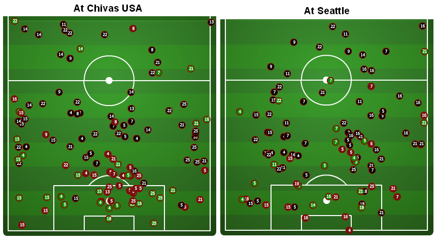 Of the outside backs, against Chivas USA, Sheanon Williams had only seven passes in the final third, of which three were successful. For Gabriel Farfan, it was two passes in the final third against Chivas, one of which was successful. Fast forward to Seattle where Williams had 24 passes in the final third, 12 of which were successful, while Garfan had seven passes, all of which were successful. Not only did both outside backs record more passes, they were more accurate, with Williams improving from 43 percent accuracy to 50 percent and Garfan from 50 percent to 100 percent accuracy.