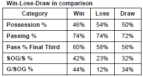 I wanted to see how the Union’s performance in a draw differed compared to a win or a loss in five categories: possession, passing accuracy, passing accuracy in the final third of the field, shots on goal/ attempts on goal percentage and goals/shots on goal percentage. Would there be a simple correlation in these categories? In other words, would the averages for these categories be best in wins, worst in losses, with draws somewhere in the middle?