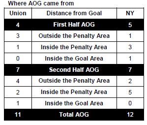 Looking more deeply at the attempts on goal, it can be argued that New York produced higher quality attempts to score, with three long-range efforts from outside the penalty area, eight attempts from within the penalty area, and one from the goal area. In comparison, the Union had seven long-range attempts, three from within the penalty area and one from inside the goal area.
