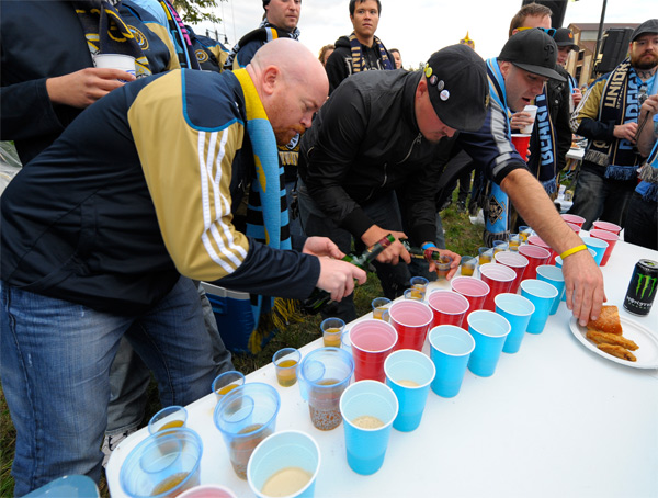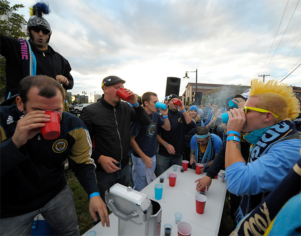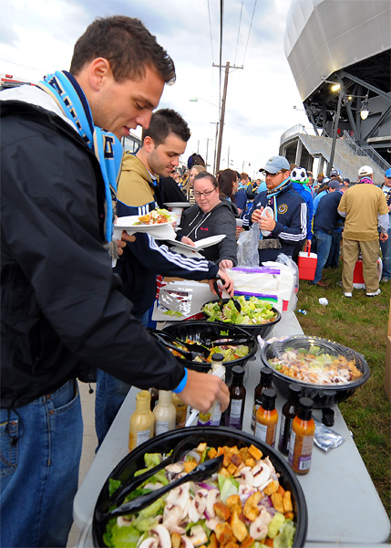 Photo by Earl GardnerPre-bus ride tailgating at PPL Park. DJ Travis “It’s not a skirt, it’s a kilt” Rego prepares to head up the Ginger Bus.