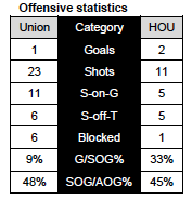 The Union doubled the Dynamo’s number of attempts on goal—and nearly doubled the number of shots on goal—and their shots on goal from shots attempted percentage of 48 percent was greater than Houston’s 45 percent. The Union’s goals/shots on goal percentage of 9 percent was less than Houston’s 33 percent.