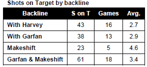 The back line with Harvey allowed an average of 2.7 shots on target over 16 games played, a very impressive number. It may therefore come as a surprise to those who continue to rue the loss of Harvey that the regular back line with Garfan allowed an average of 2.9 shots on target over 13 games, just .2 more than the Harvey average.