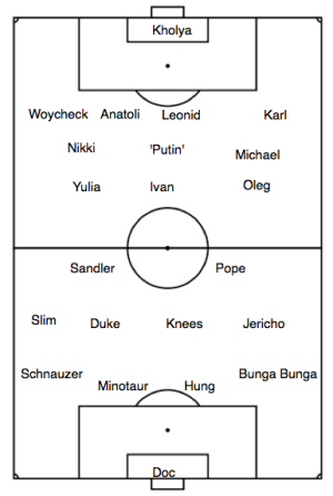 The renewed spirit on our team came down on Pope like a cloud of cocaine. Furiously he catapulted himself to the ball as soon as the whistle sounded. Yulia had to quickly pass the ball back to Putin. By the time he received the ball Sandler was on Yulia, and Jericho and Slim covered the wingers. The quickness of the attack surprised them. Putin had to turn away with the ball, and dribble it back. He chipped the ball to their central defender Leonid (who looked like Leonid Brezhnev) who headed the ball into the goalie’s hands. Pope was there almost at the same time. He was literally trying to head the ball out of his hands. The ref let it go.