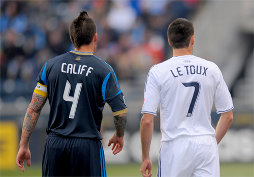 Philadelphia Union center back Danny Califf and Vancouver Whitecaps forward Sebastien Le Toux, March 31, 2012, at PPL Park. Photo: Earl Gardner
