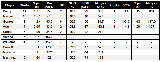 Starting with shots, Freddy Adu is the only player at present whose shooting rate is above 2 shots per 90 minutes. He’s also the team’s most frequent shooter at a shot every 43.9 minutes, which isn’t exactly a thrilling number. Lionard Pajoy has the next best rate at 1.61 shots per 90 minutes but he hasn’t had a shot on or off target over the last three games.