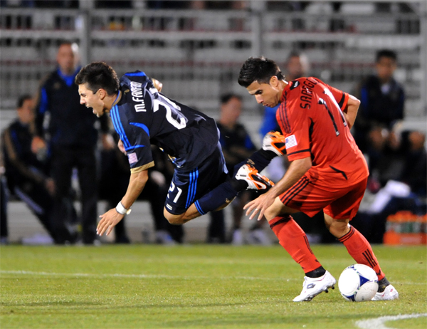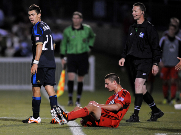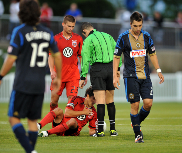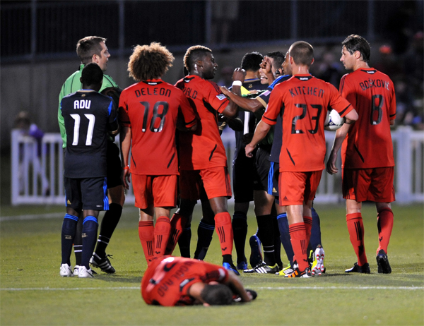 Perry Kitchen and Michael Farfan are separated by the ref who lost control 60 minutes prior.