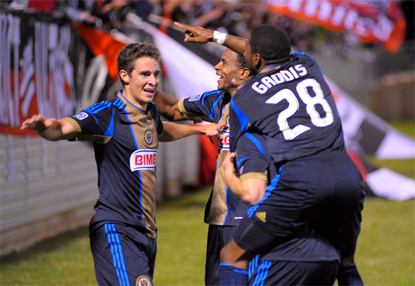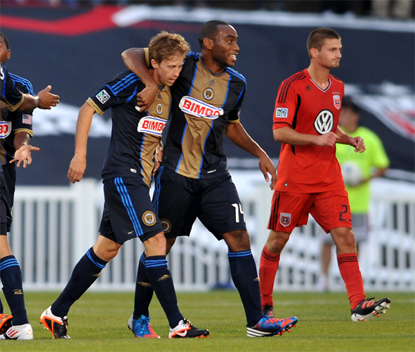 Amobi celebrates Brian Carroll’s goal.