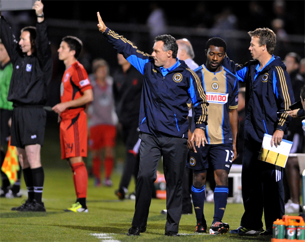 Peter Nowak gives out instructions as Michael Lahoud comes off the pitch.