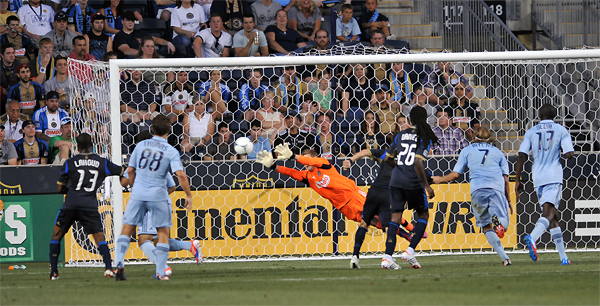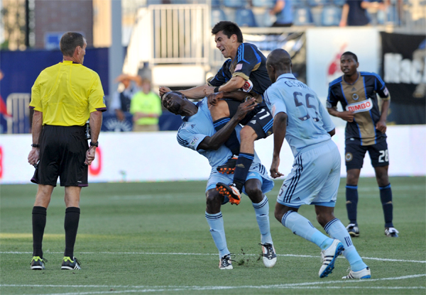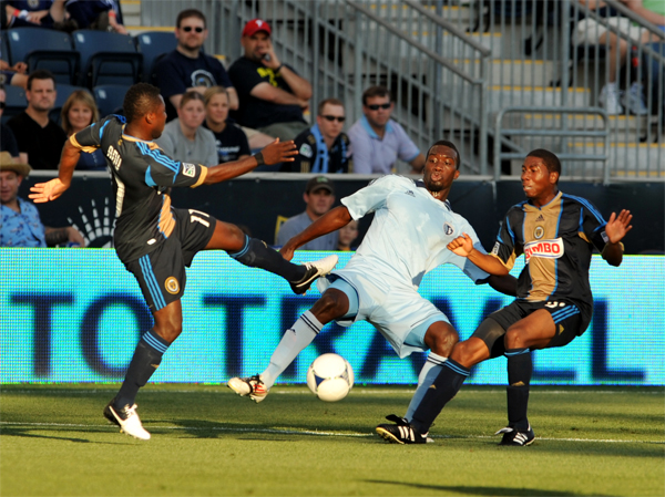 Freddy Adu and Raymon Gaddis do their best to shut down SKC.
