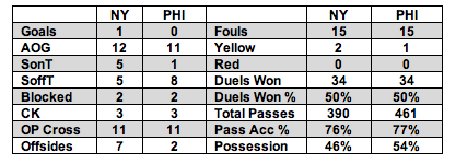 TOTAL SHOTS: 7 (Sebastien Le Toux 2, Carlos Ruiz 2); SHOTS ON GOAL: 3 (3 tied with 1); FOULS: 8 (Stefani Miglioranzi 3, Sheanon Williams 3); OFFSIDES: 2 (Danny Mwanga 1, Carlos Ruiz 1); CORNER KICKS: 1 (Justin Mapp 1); SAVES: 1 (Faryd Mondragon 1)