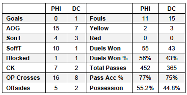 “The Union outshot D.C. 10-8 (with only three on goal) and had six corner kicks to just two for D.C., but it didn’t matter as D.C. broke an eight-game winless streak to win their first game in two months.”