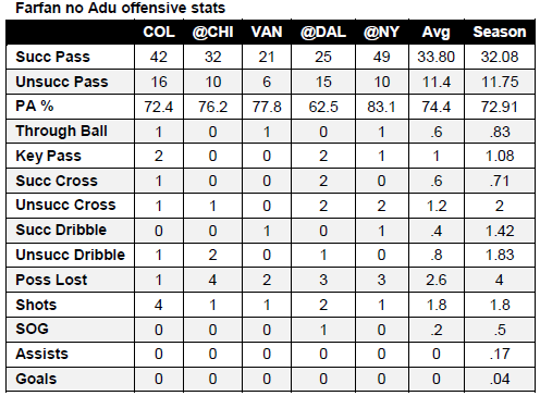 Farfan has 5 appearances (4 starts, 405 minutes) when Adu did not play, including being subbed on at the start of the half against Vancouver. In each of the games he is listed as a midfielder except for the away game against Dallas, where he is listed as a defender. Despite recording one of his lowest passing accuracy percentages of the season in that game (against DC his passing accuracy was 59.6 percent), he still managed to record 2 key passes and 2 successful crosses from 4 crosses attempted. In the 5 games without Adu, his passing averages are generally better, as is the possession lost average, while the shots average is the same. To varying relatively smaller degrees, the opposite is true of the rest of his offensive stats.