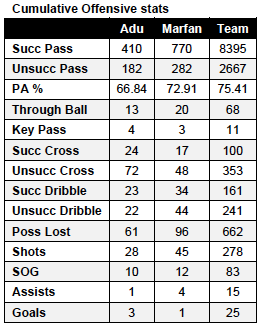 There are some 40 individual statistical events separated into six categories recorded for field players on the Opta chalkboards. With 25 games to go through, I selected 14 offensive categories and six defensive categories to examine. In addition to individual numbers for Adu and Farfan, I also recorded the team’s numbers for each category for the sake of context.