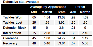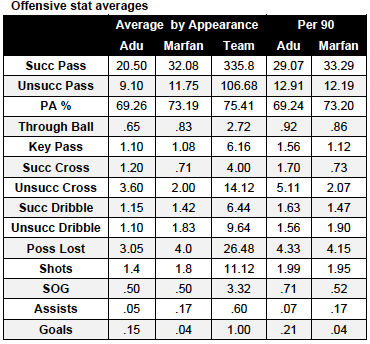 n when the season totals are averaged. In fact, outside of passing statistics, the only categories that show a difference of more than a .5 — which would mean that an additional instance of a particular event could be expected to happen once every 2 games — are successful cross and unsuccessful cross for Adu and unsuccessful dribble and possession lost for Farfan.