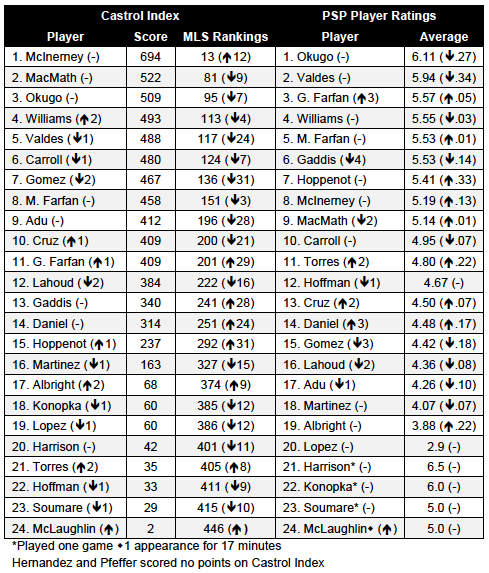 Naturally there were differences. For example, Gabriel Gomez, Freddy Adu, Michael Lahoud, and Danny Cruz all featured in the top 11 of the Castrol Index but were not in the top 11 of the PSP player ratings averages. The top five of the PSP player ratings averages were all defensive players. Jack McInerney, No. 1 on the Castrol Index, was No. 9 in the PSP ratings.