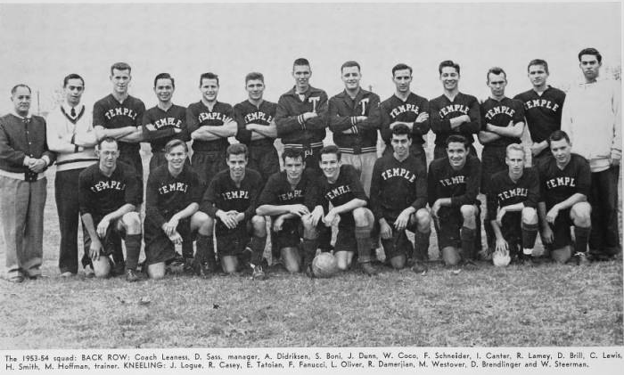 Philadelphia liked its soccer, and the college game reflected the strength of Philadelphia youth soccer. All the local colleges fielded strong teams–Temple, University of Pennsylvania, La Salle, and Drexel leading the way. Many of the Lighthouse-Northeast H.S. contingent received full scholarships to Temple, one of approximately 90 varsity programs around the country in the early ‘50s. The strongest teams, like Temple, the University of San Francisco, Queens College, and Penn State University were fed by the influence of urban youngsters, while in the Ivy League, New England’s prep schools provided the talent. No women’s varsity soccer programs existed.