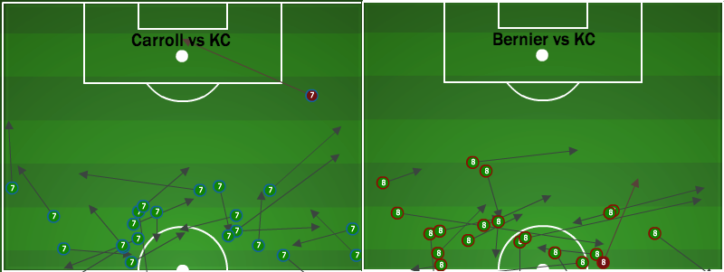 For further evidence, observe how similar the two midfielders appear against Kansas City, a team that defeated both Philly and Montreal. When Bernier could not provide depth and range to the Montreal attack it was considerably less potent, even with weapons like Felipe and Marco Di Vaio.