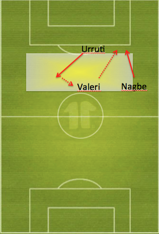 Urruti checks into the soft space in front of the defense, dragging Berry or pulling Okugo forward. When he receives the ball Urruti drops it to Valeri, facing upfield. He can find Nagbe in the space vacated by the striker.