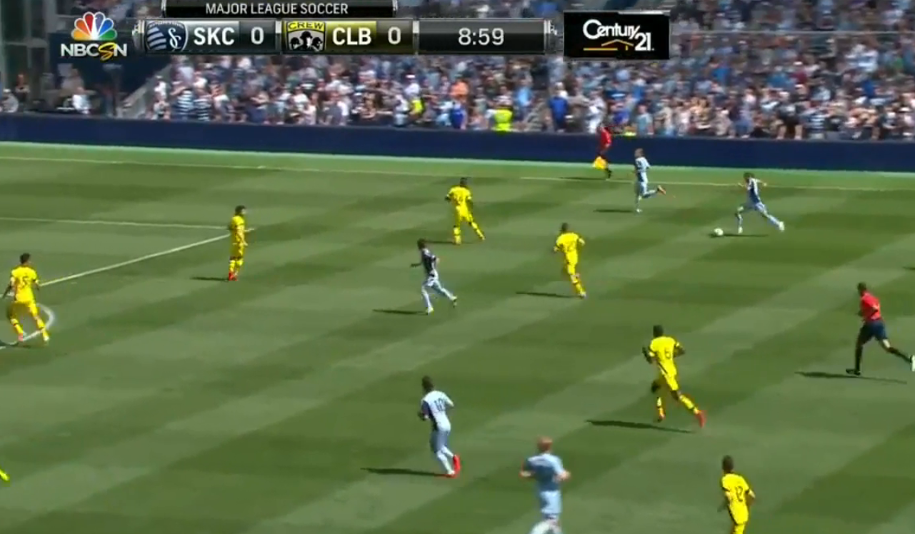 The KC buildup is exemplified by their first goal in the 2-0 win against Columbus on May 4. The Crew sat back to prevent Rosell from getting involved. But in order to mark Nagamura and Feilhaber, the midfield got narrow, leaving Zusi open on the far flank. Besler puts the ball across field to Zusi, who can run at the defense before Wil Trapp recovers. This gives space on the wing to Chance Myers, who is happy to gallop into the play and put in a low cross that pinballs around until Jacob Peterson zings it home.