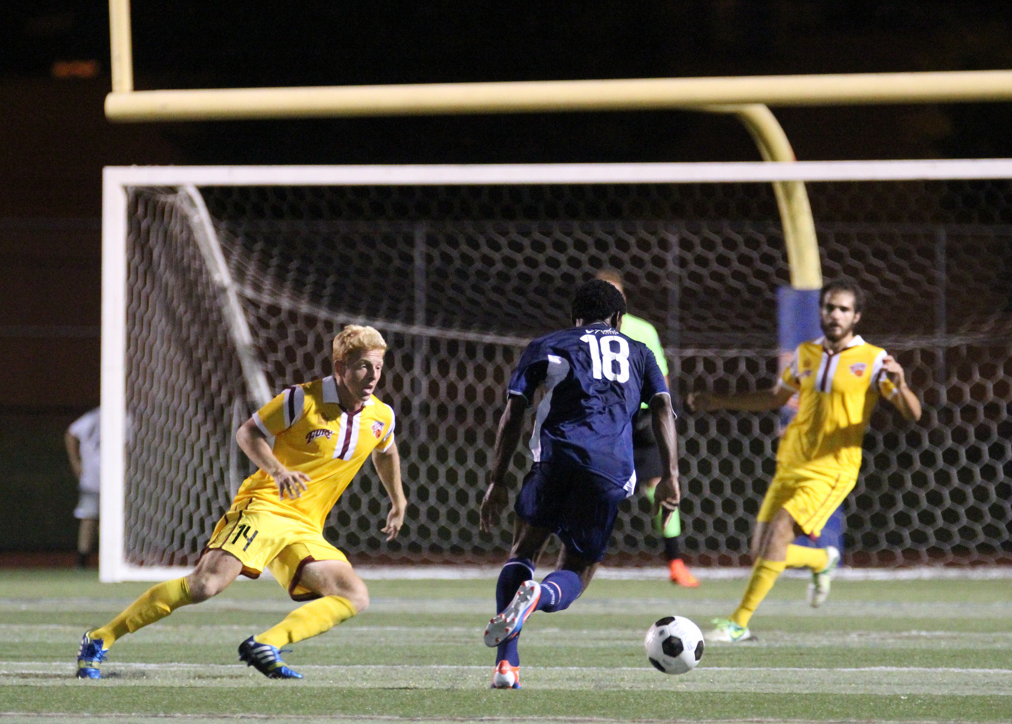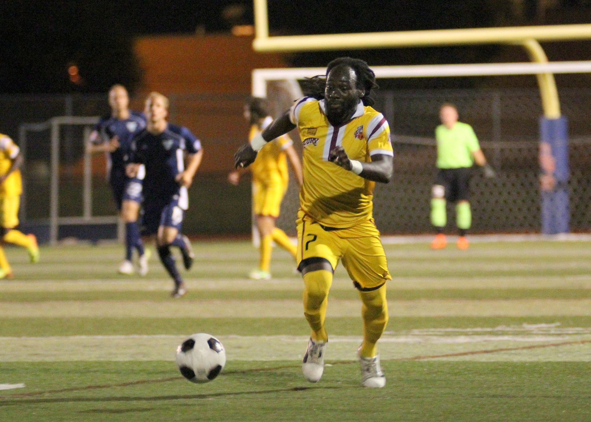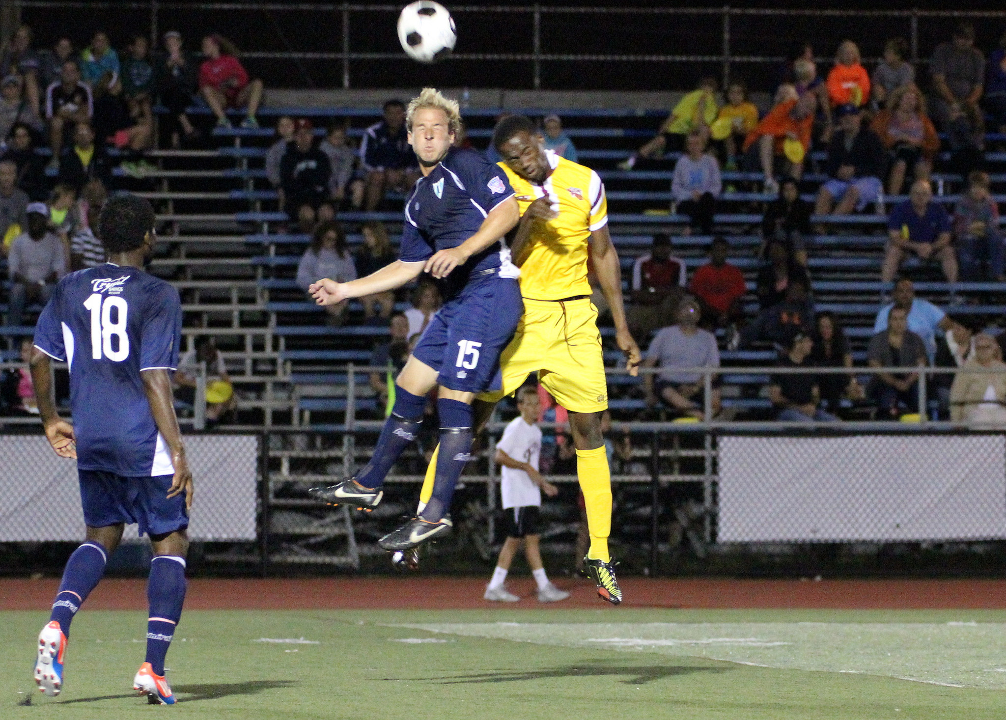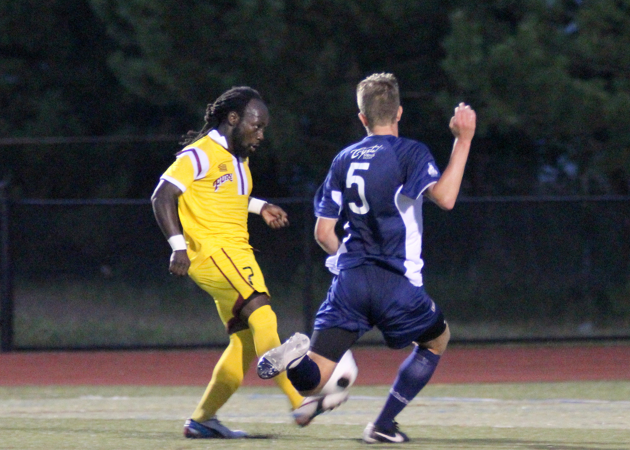 Seydou Ba keeps focus on the ball as Trey Leggett flies in