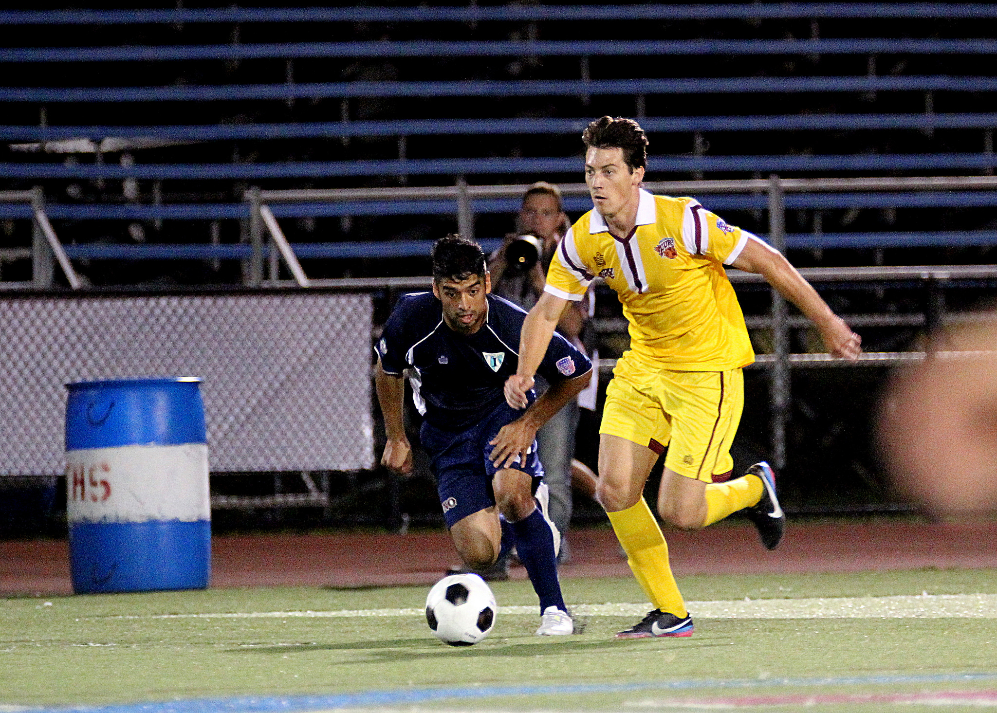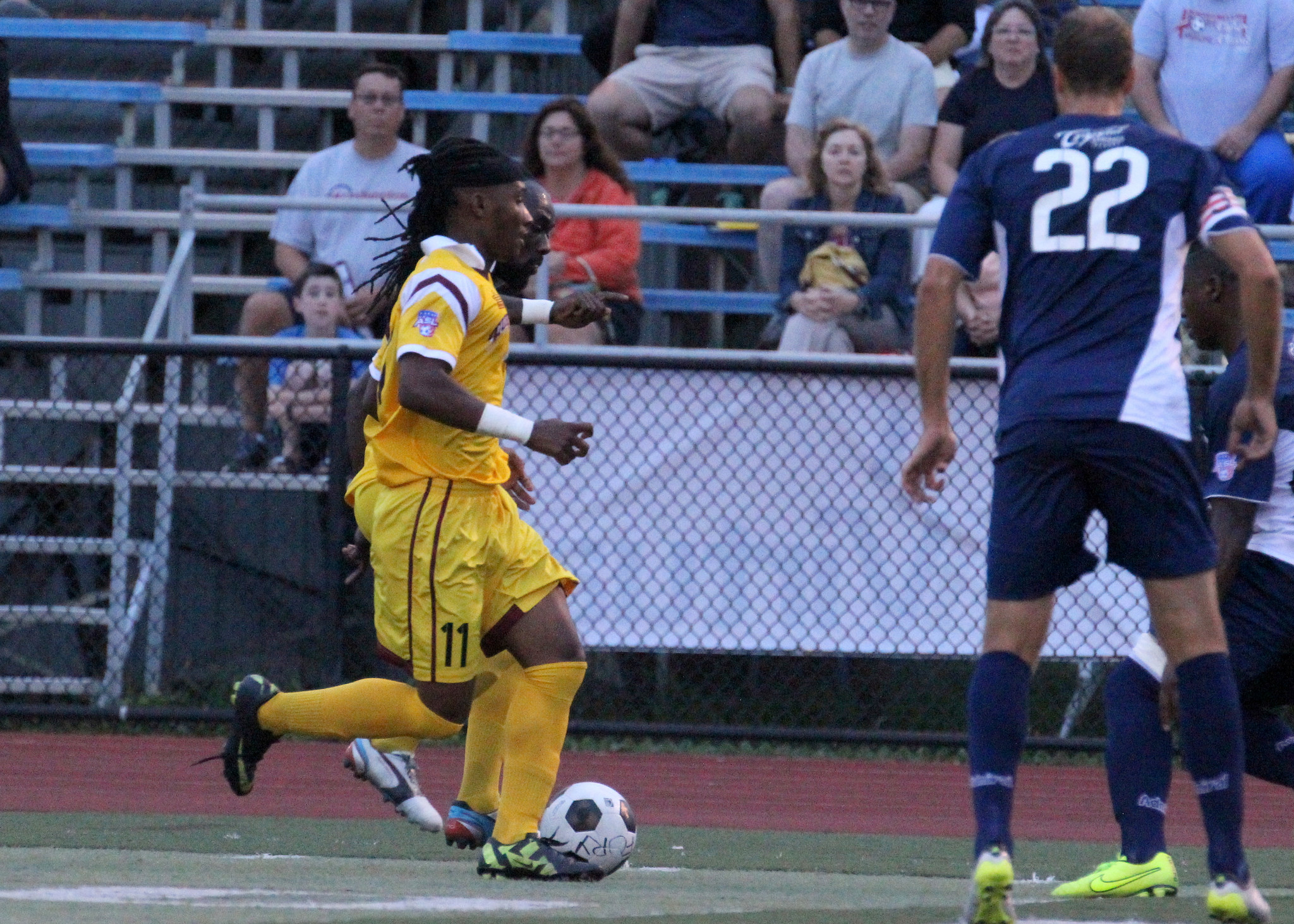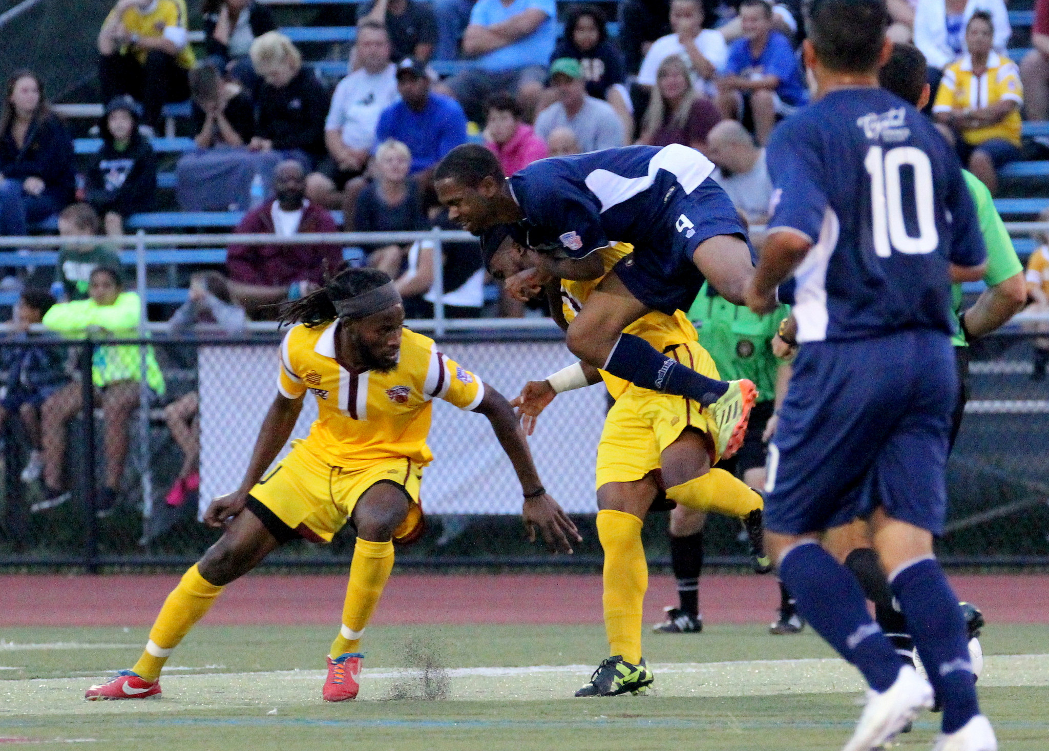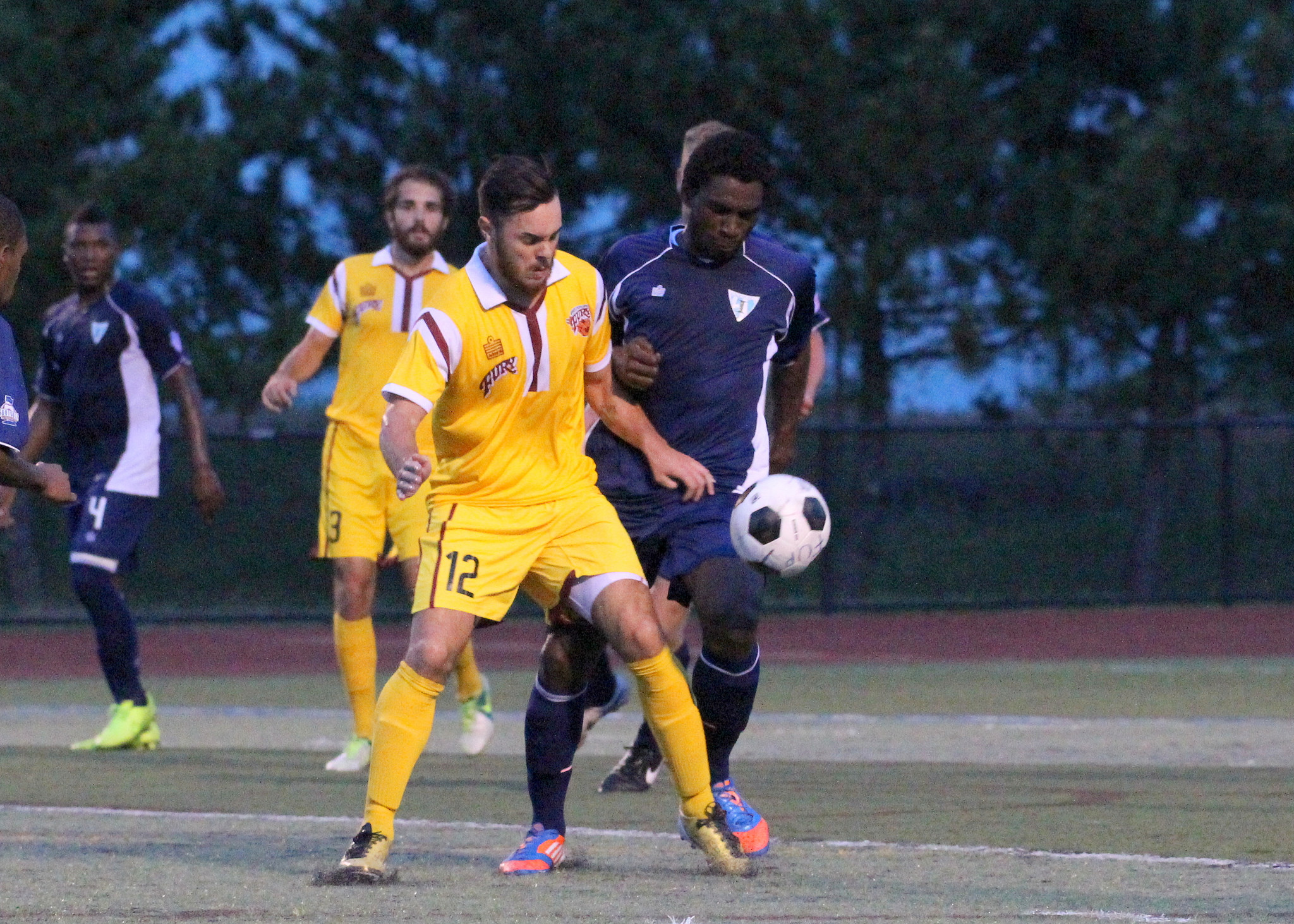 Seydou Ba keeps focus on the ball as Trey Leggett flies in