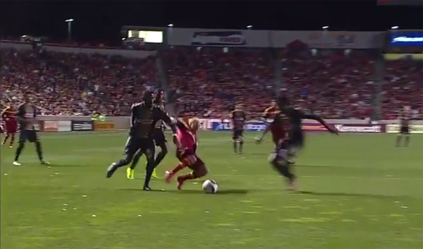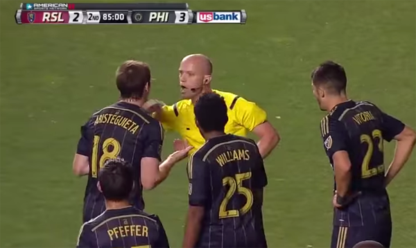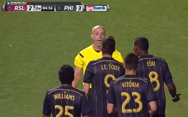 On the free kick, at midfield we’re trying to sub in Conor Casey. [The officials] wouldn’t acknowledge that. So, [RSL] take the free kick, it gets whipped into the box, and Mulholland dribbles. There’s four of our guys around him. No one touches him, and he goes down. The ref gives a PK. That’s what happened.