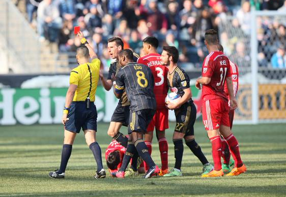 • Pfeffer was out of control. The elbow was bad. I agree though. No red card. It must be the team name that MLS and officiating has a bone to pick in light of this most recent labor dispute. Three games no fortune with the referee.