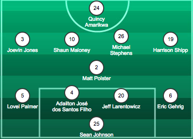 Fourth different starting line-up, same formation as RSL and FCD: flat back four, two DCMs, two high-ish FMs with an ACM, and a lone striker. The way I would express your point is ” 360 minutes plus stoppages, four different ACMs: Nobody, Maidana, Pfeffer, and (presumably) Nogueira.”