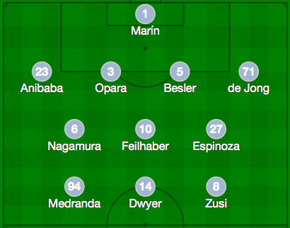Ideally, KC would move the fullbacks up the pitch and use Matt Besler’s passing range to quickly rotate the ball until either Sinovic or Chance Myers had enough space to carry things forward and use their own quality on-the-ball ability to pick out a central pass to Feilhaber or a wide ball to Zusi. With Marcel De Jong and Jalil Anibaba as fullbacks, however, Kansas City doesn’t have the confident passers that have been the secret ingredient in the team’s success. Both De Jong and Anibaba are perfectly competent — and De Jong can rocket a shot or a great cross — but neither is as active in build-up play as their predecessor.