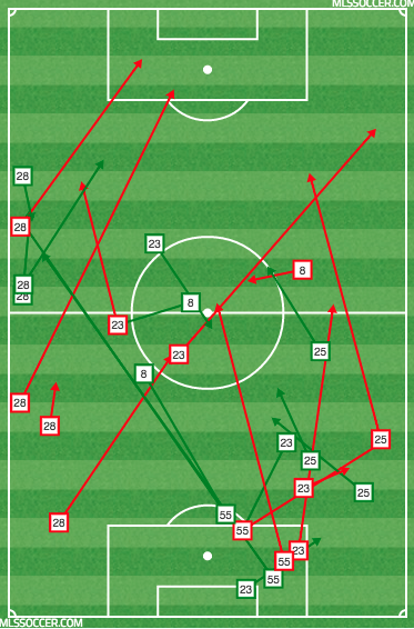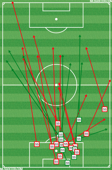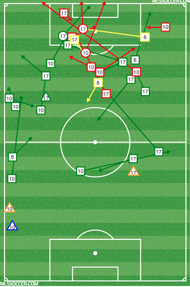 New York’s strongest stretch of the game came in the 15 minutes following halftime, where they thoroughly dominated play and scored their lone goal of the day. Part of this has to do with the introduction of Khiry Shelton, who buzzed about attempting to disrupt the Union backline. If you take a look at the defensive passing chart from those 15 minutes, you see a whole lot of aimlessly blasted balls — the sorts of passes which could be immediately recovered by NYC and converted into more pressure.