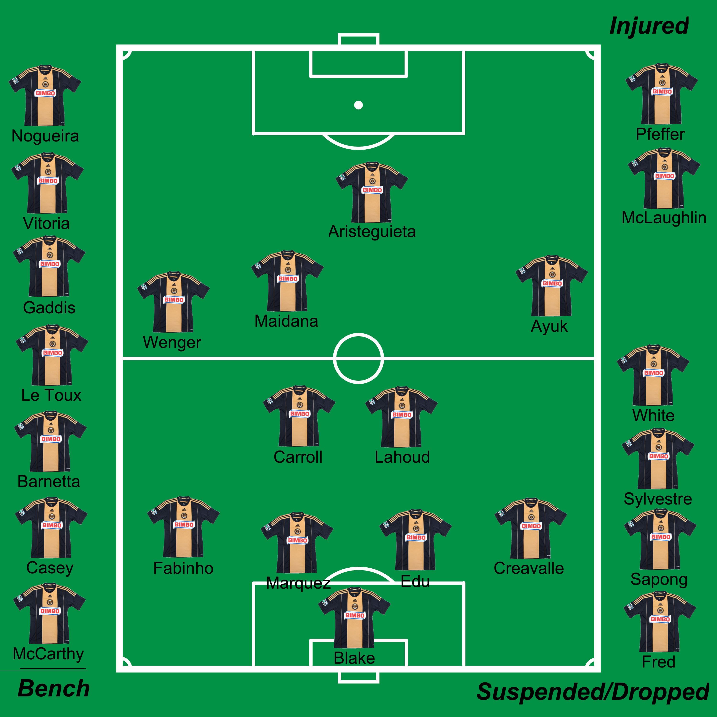 Umm… this is a tough one. It certainly seems like the right time to rest players like CJ Sapong, Sebastien Le Toux, and Tranquillo Barnetta. All three have logged endless minutes as they jell into the face of the Union offense. Additionally, risking Vincent Nogueira’s ever-shaky health in a match that, if everyone is being honest, means very little to the Union seems absurd. Although Curtin would likely prefer to rest Ray Gaddis and Fabinho, the truth is that he only has one Warren Creavalle. Philly’s lack of depth at the fullback position means at least one of the two fullbacks will see ninety minutes on Saturday. In the center, Maurice Edu will likely play again as he recovers full fitness. But Steven Vitoria could slot in for Richie Marquez if the young defender needs a break.