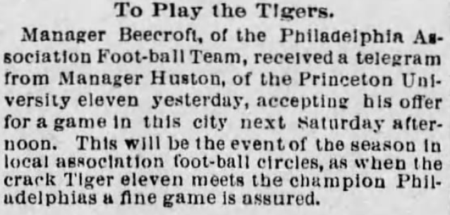 Manager Beecroft, of the Philadelphia Association Foot-Ball Team, received a telegram from Manager Huston, of the Princeton University eleven yesterday, accepting his offer for a game in this city next Saturday afternoon. This will be the event of the season in local association foot-ball circles, as when the crack Tiger eleven meets the champion Philadelphias a fine game is assured.