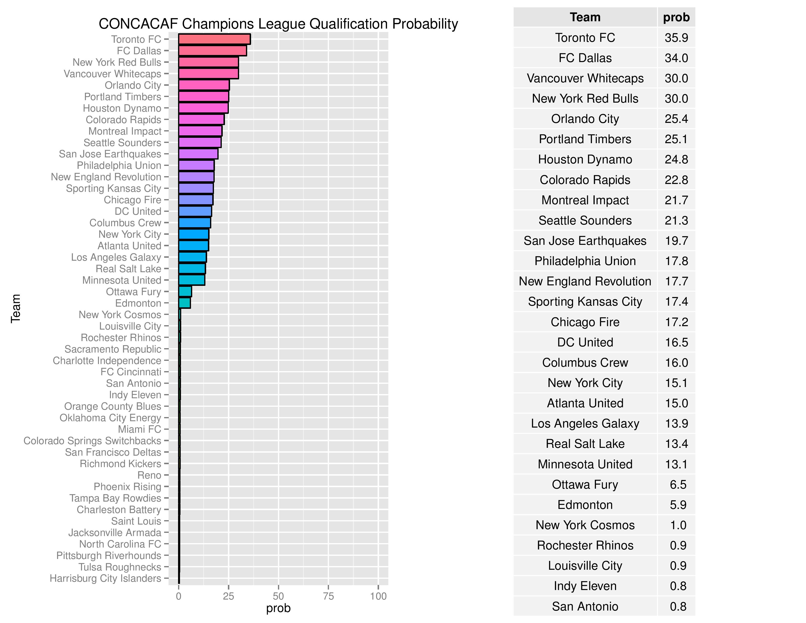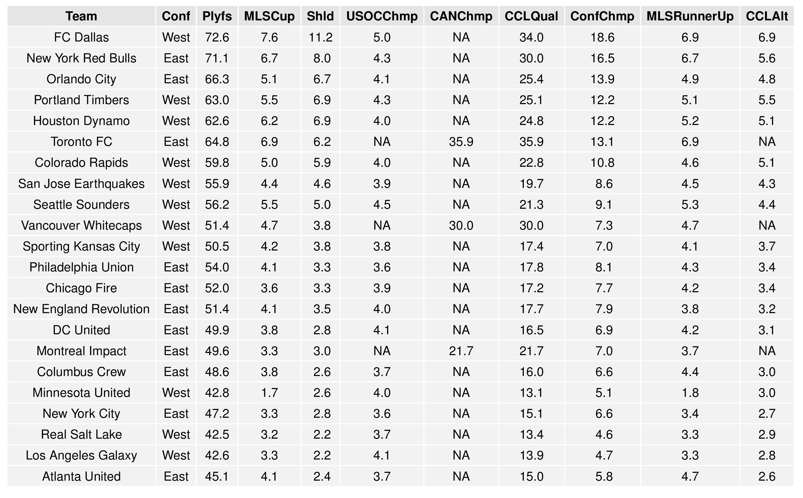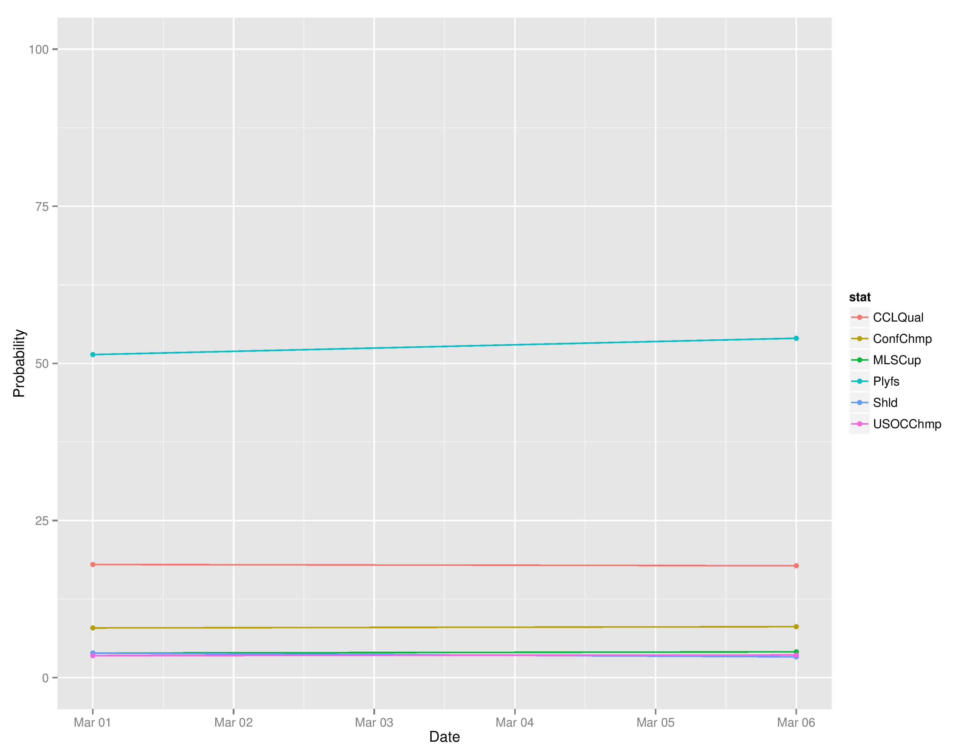 As for Philly’s 7th eastern power rank vs. 4th-best-playoff-odds, this is due to model uncertainty. If you look on the Power Rankings graph, you can see how closely the model distinguishes each other’s strength (which is to say it barely notices). On the other hand, Philadelphia got a point on the road, compared with Montreal and New England’s losses on the road and DC United’s draw at home. For the moment, points-in-hand and home-field-advantage are the driving factor behind most of the model’s season projections, and therefore it makes sense that the Union’s better results would make them a few percentage points higher on the playoff race.