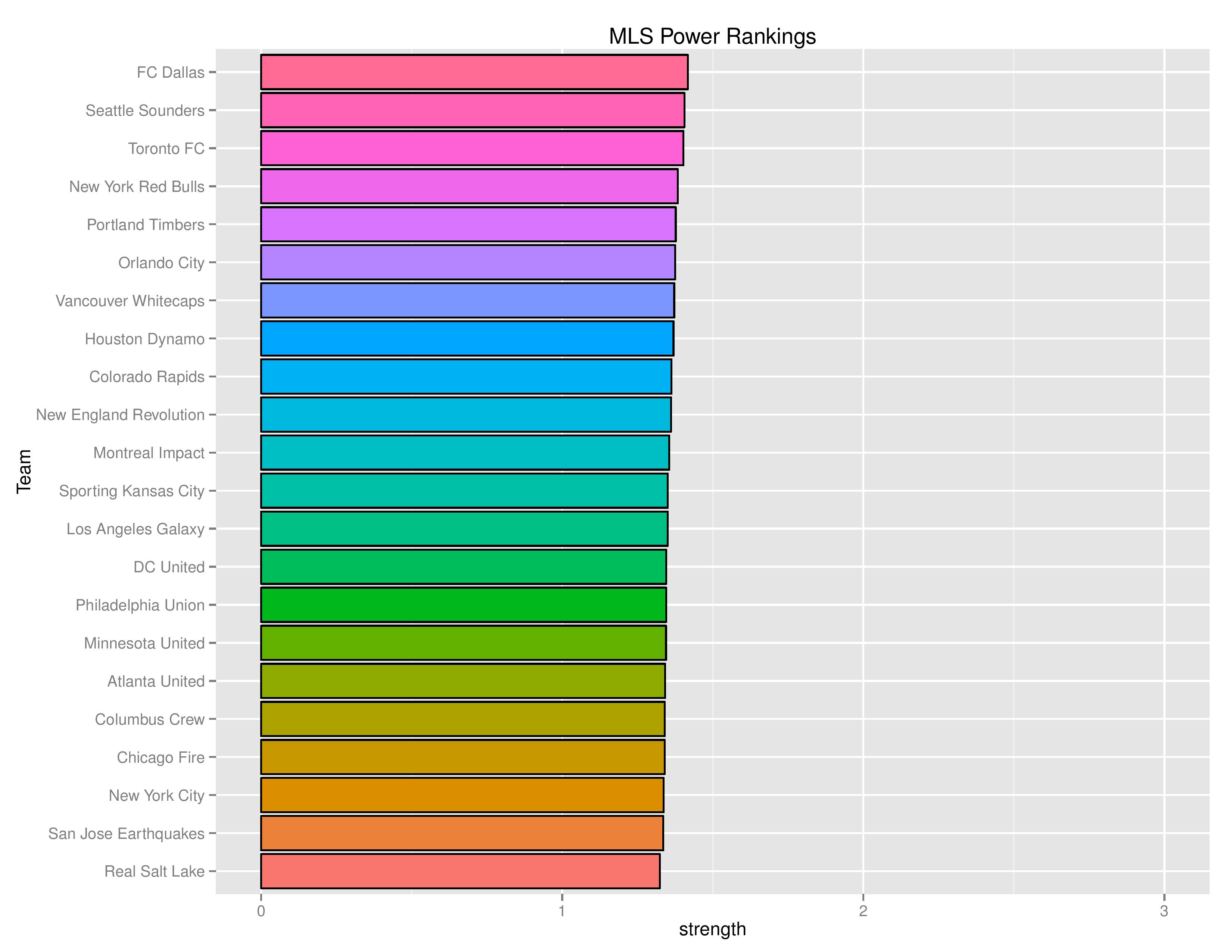 The “Power Rankings” we concoct are the “strength” of the team according to competitive expectations. They are computed by forecasting the expected points (3 x win-probability + 1 x draw-probability) against every MLS team, both home and away, and taking the average per team.