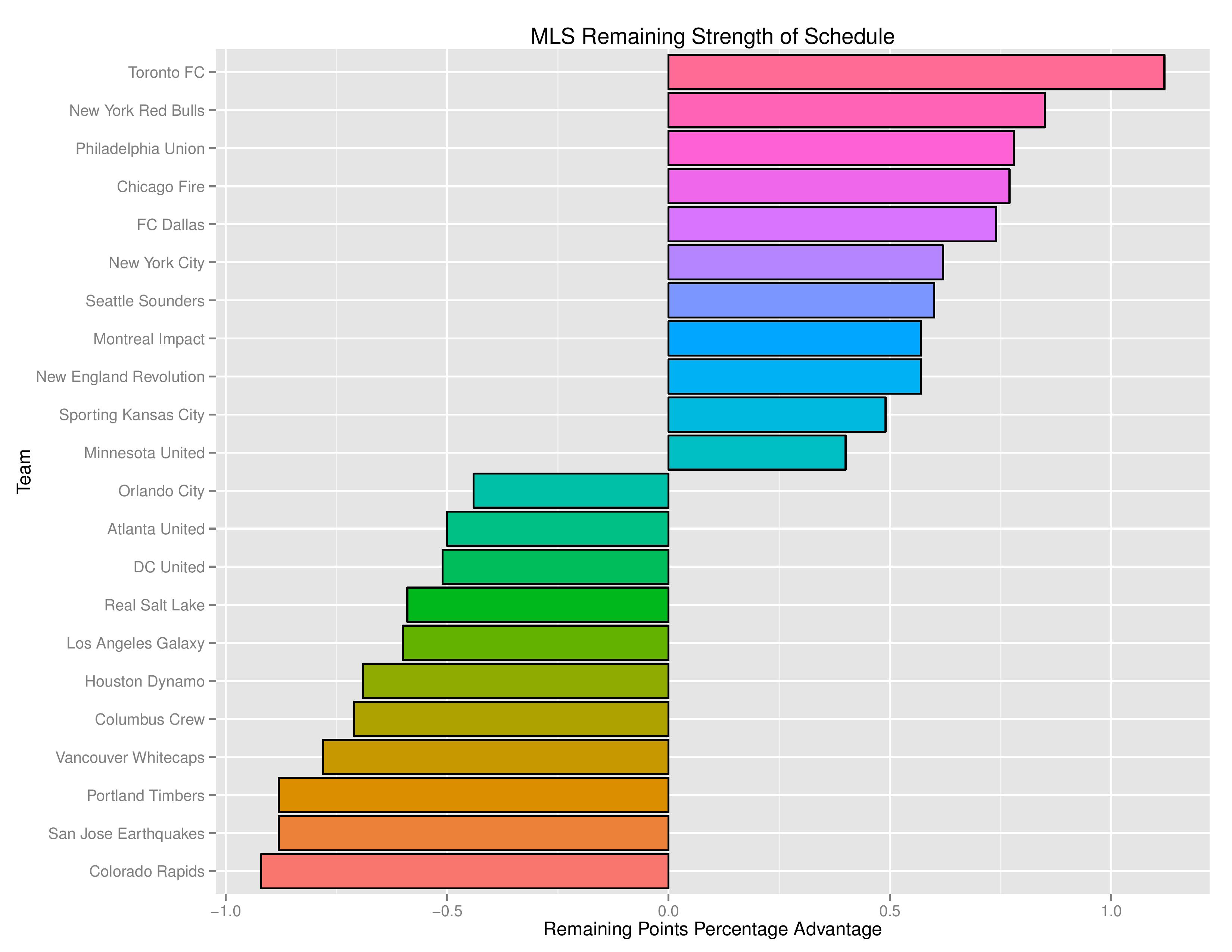 Philadelphia has one of the ‘easiest’ remaining schedules, in large part because they have one more home match than away matches remaining. It can also be true that a better team has an ‘easier’ schedule simply because they do not have to play themselves. This almost certainly helps a case like Toronto’s.