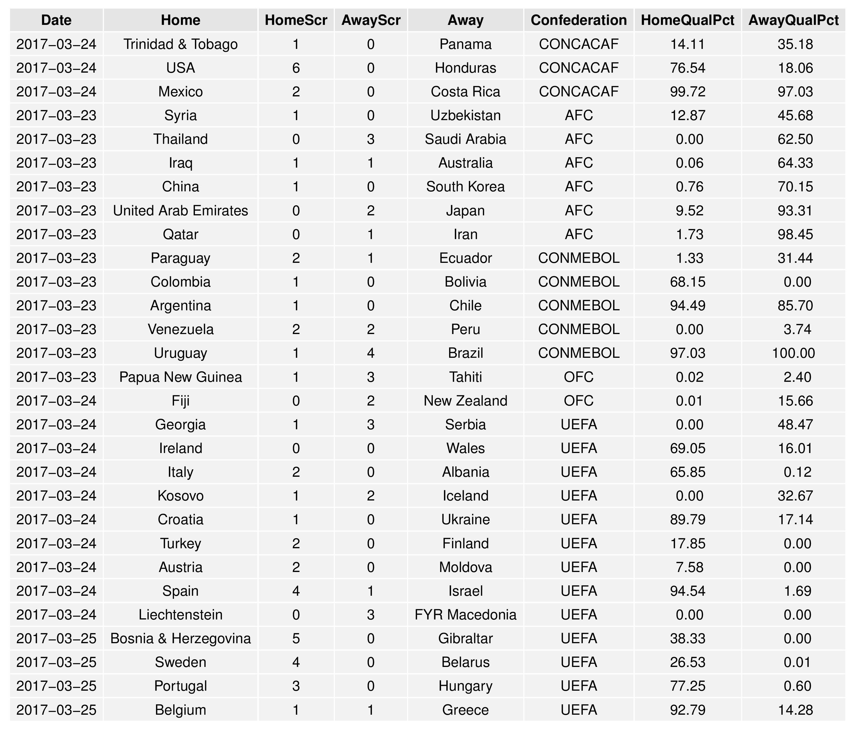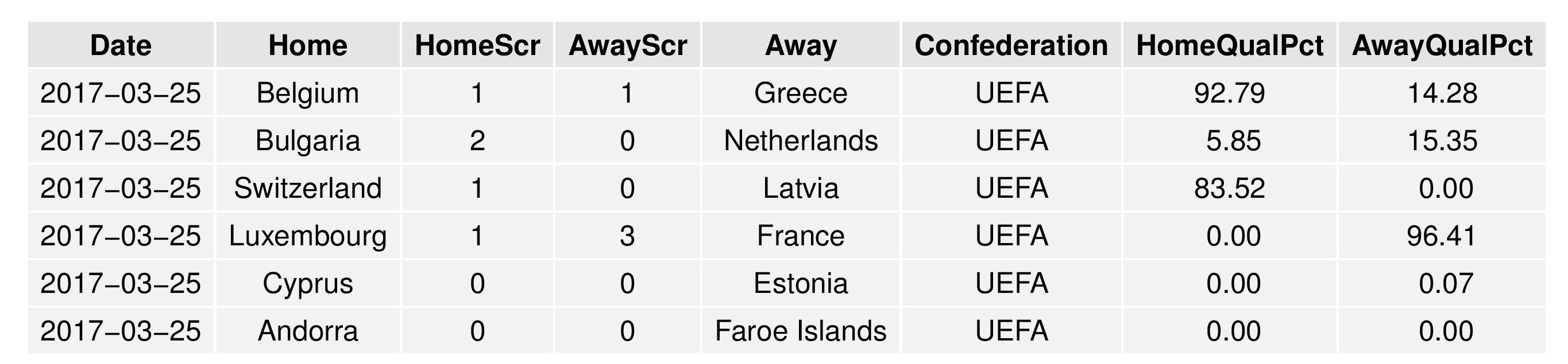 The following just shows the most recent World Cup Qualification matches included in the model by federation, accompanied by their current qualification odds.